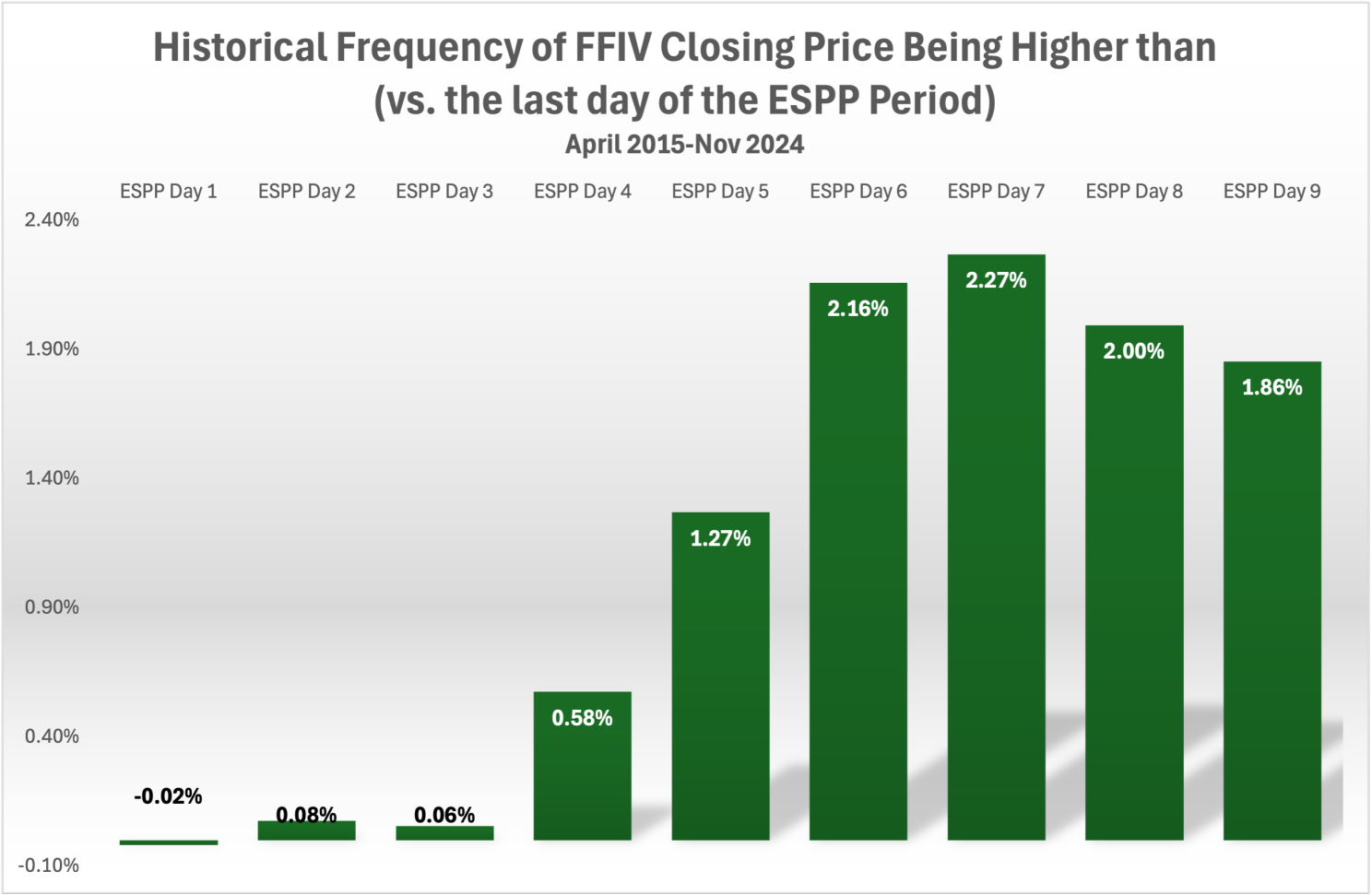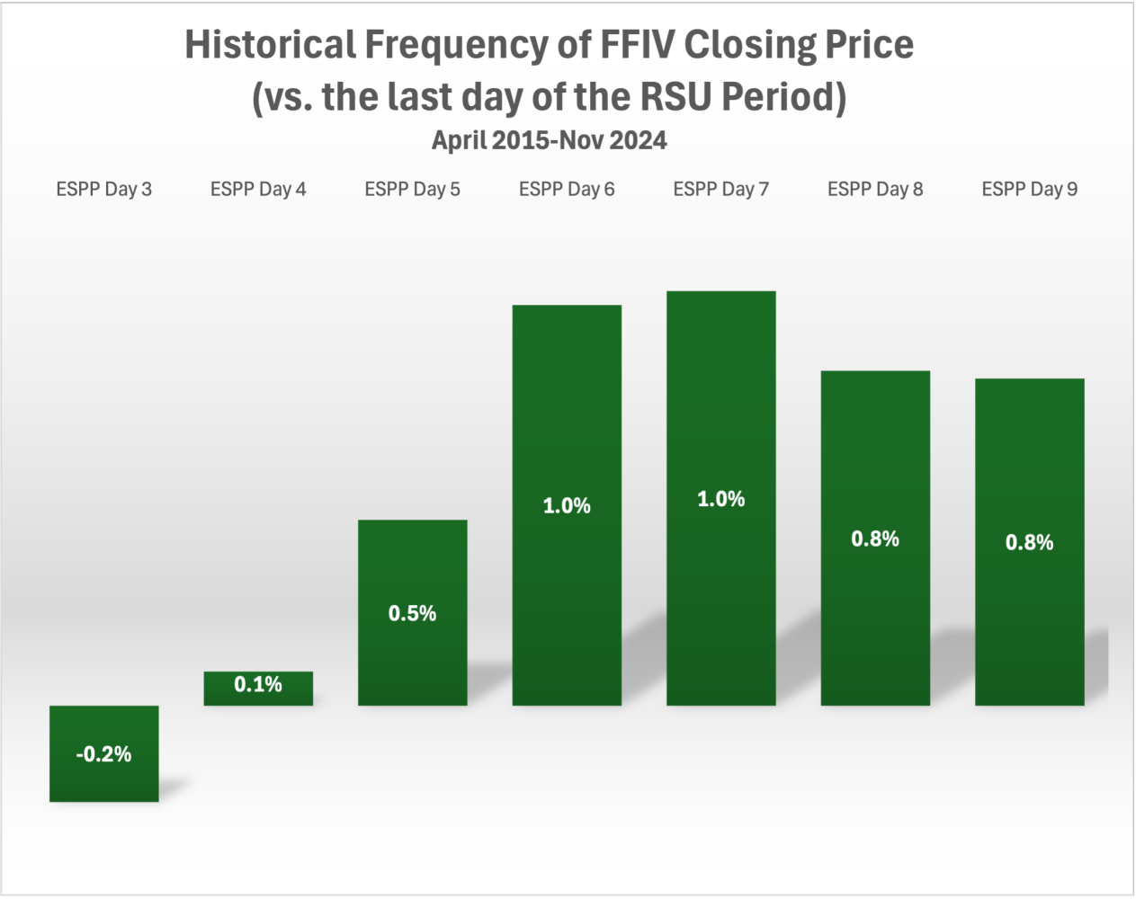 RSU historical price trends appear similar but not quite as strong. See figure 2. Remember that FFIV RSUs aren't available for sale (due to sell-to-cover tax requirements) until the third trading day of the month. Also, these occur four times a year instead of twice a year, like ESPP shares. Selling RSU shares on the 4th day after receipt (equivalent to the 6th ESPP trading day) yielded about 1.2% additional value, on average. If you're dealing with, let's say, $50K of RSUs each year, then that's about $600 of additional gain on average.